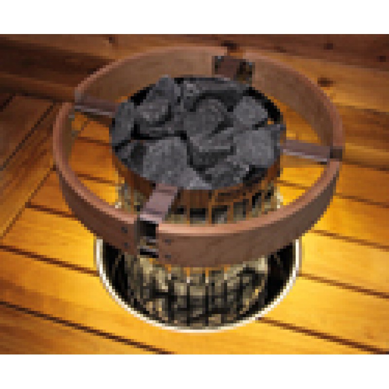 Модное и надежное защитное ограждение состоит из четырех деревянных элементов (аркообразной формы), которые крепятся друг к другу, а также к каменки скобами из нержавеющей стали. Ограждение выполнено из древесины — термообработанная осина. Ненавязчивая подсветка, поможет сделать вашу парную уютной.