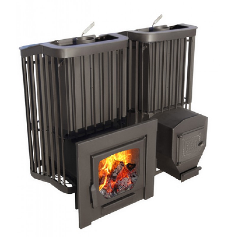 Печь Варвара Терма Каменка с сетчатым кожухом для закладки камнем и с панорамным жаростойким стеклом.