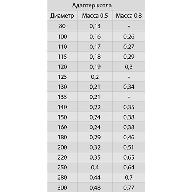 Предназначен для подключения теплогенерирующего аппарата к системе дымоотведения. Элемент выполняется из стали толщиной 0,8 мм. В таблице приведены размеры и массы элемента в зависимости от диаметра и толщины стали.
