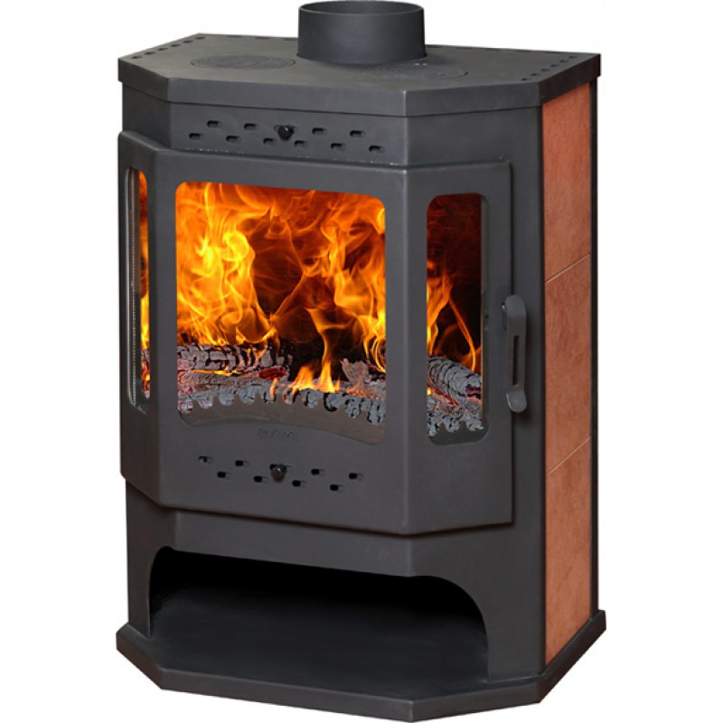 Она оборудована теплообменником и плитой для разогрева и приготовления пищи. Дымоход диаметром 200 мм подключается с задней стороны. Боковые стороны печи украшены цветной керамической плиткой. Рациональная конструкция конвектора позволяет быстро снимать тепло камина. Конвекционный кожух изготовлен из 3-миллиметровой стали. Для производства топливника берется 6-миллимитровая сталь, внутри топка выложена шамотом, а колосник сделан из чугуна. Обращает на себя внимание оригинальная дверца. Жаропрочное прозрачное стекло расположено на ней с трех сторон, что способствует более объемному созерцанию процесса сжигания дров. Система чистого горения долго не позволяет стеклу испачкаться копотью.