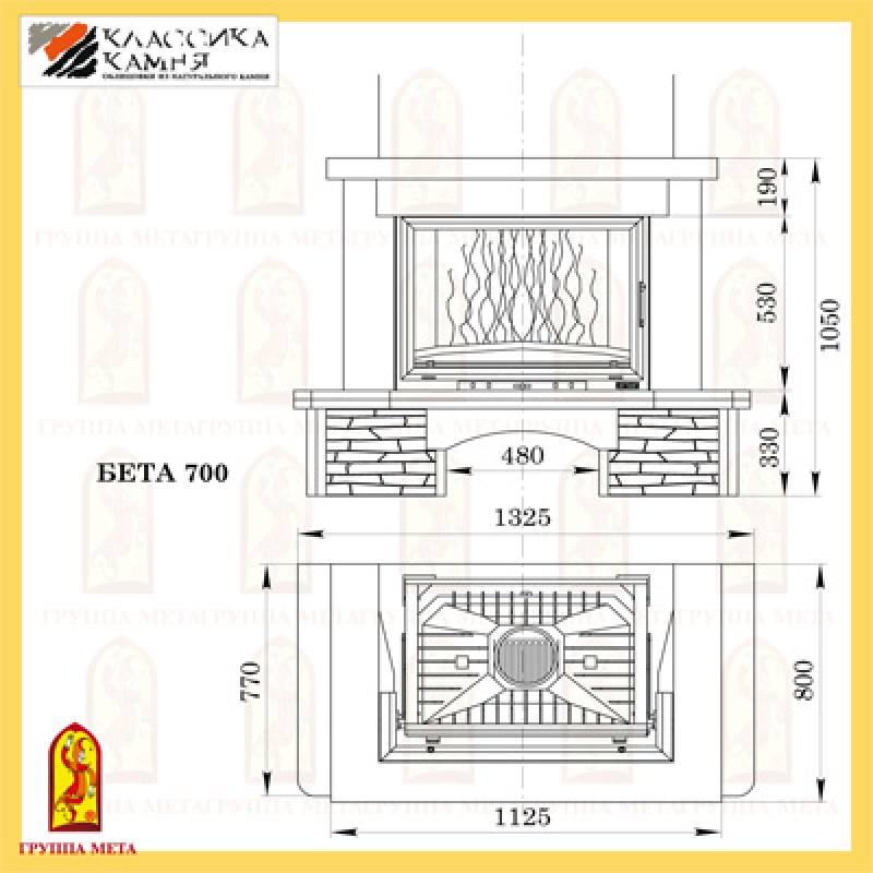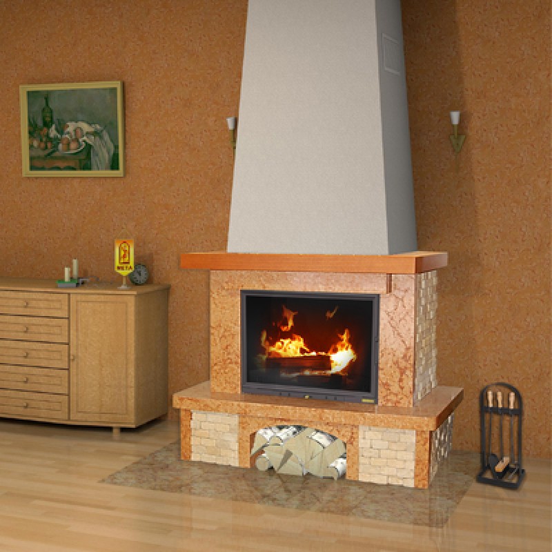 Материал: Галтованный доломит (жёлтого цвета), натуральный мрамор с обработкой «Антик» (терракотового цвета), балка - МДФ шпон дуба, окрашена