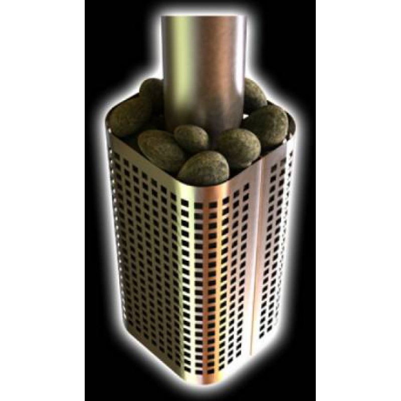 Экономайзер, навешивающийся на дымоход и заполненный камнями, позволяет снять излишнее тепло со стенок трубы и направить его на прогрев камней.