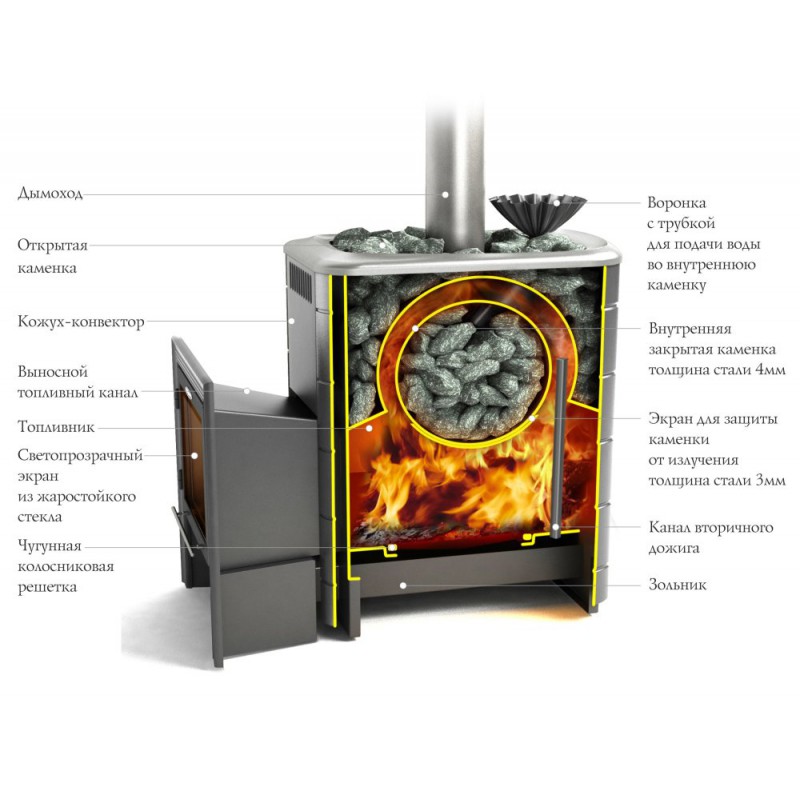 Лучше всего с задачей нагрева камней до максимальных температур справляется закрытая каменка. Именно она отличает новую «Ангару» от ранее выпускавшейся модели.