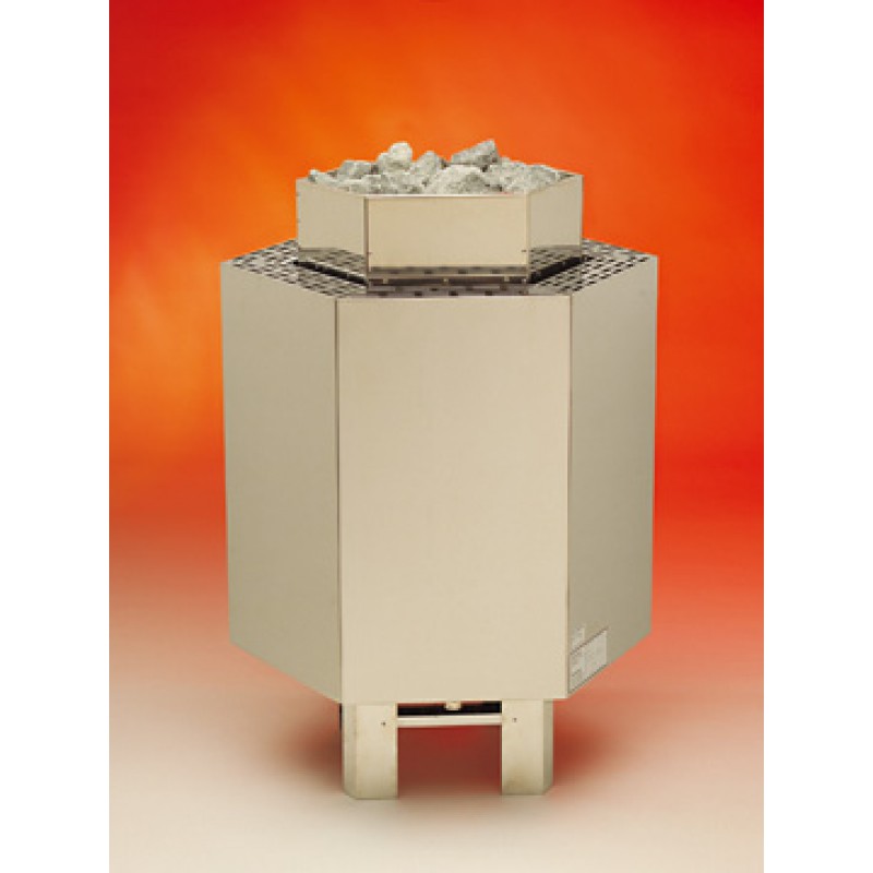 Печь для сауны для центрального размещения в профессиональной кабине. Эргономичная шестиугольная конструкция. Аппарат выглядит одинаково со всех сторон.