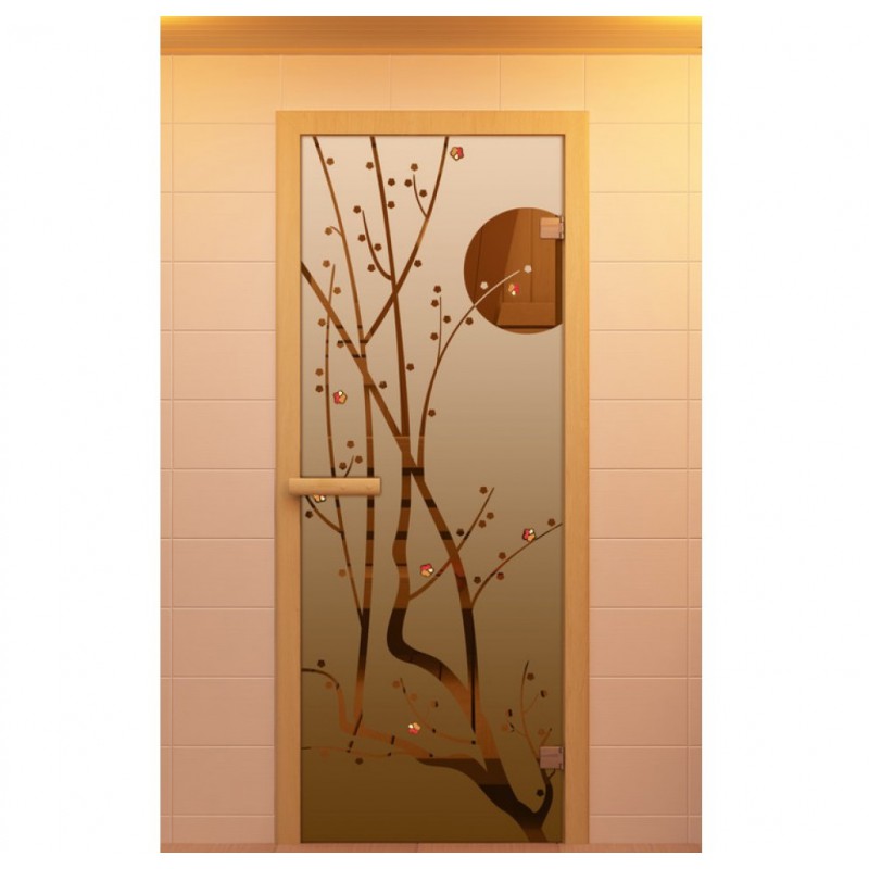 Данная модель олицетворяет японскую культуру. Дверь в парилку "Сакура", выглядит изящно, изображение традиционного японского растения нанесено фьюзингом. Стекло накаляется в печи до получения однородного поверхностного слоя, на котором вырисовывается Сакура - символ облаков. На бронзовом стекле растение смотрится нежно и не броско, но в тоже время передает японскую выдержку и мощь. Двери для спа из этой серии будут как раз кстати.