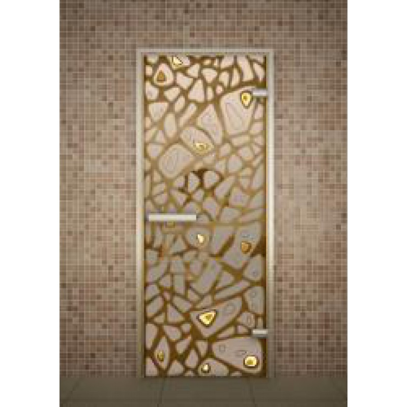 Дверь для турецкой бани с коробкой из алюминия и дверными петлями, изготовленными из нержавеющей стали. Для дверного полотна использовано закаленное тонированное стекло толщиной не менее 8 мм. Доступно три цвета: бронза, серый и синий. На поверхность дверного полотна с помощью фьюзинга, представляющего собой новейшую технологию, основанную на спекании стекла различного цвета, нанесен рисунок «морское дно». Плотное прилегание дверного полотна обеспечено с помощью специальной уплотнительной прокладки из силикона.